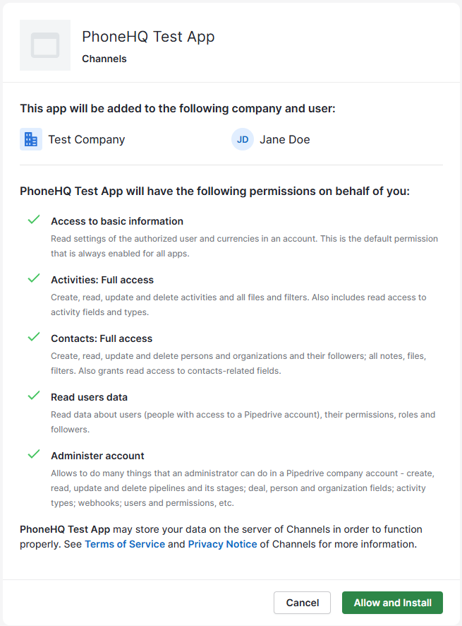 Once logged in to Pipedrive, the permissions screen will be presented. Click the "Allow and install" button to proceed.