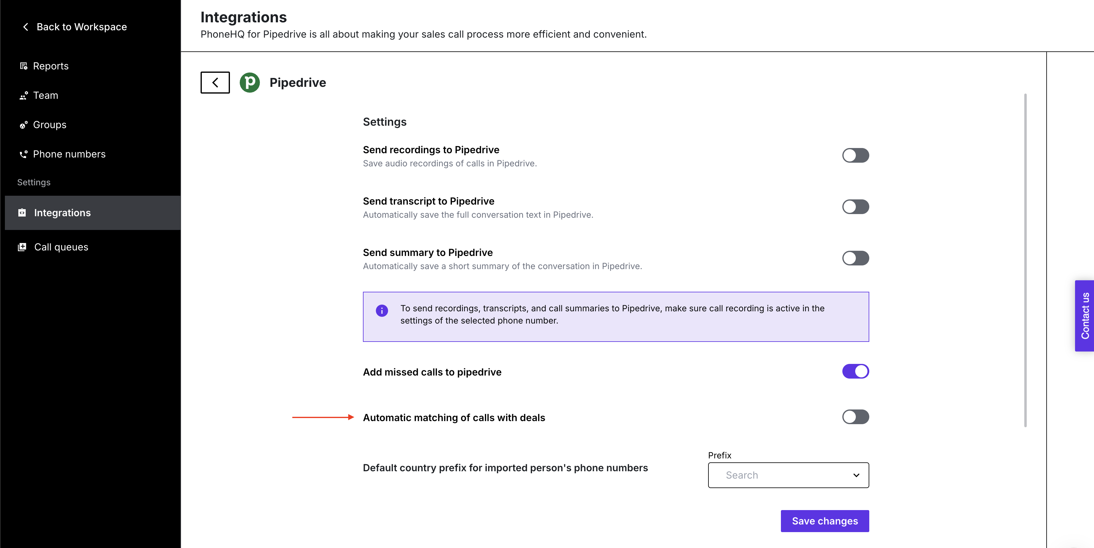 Send summary to Pipedrive - turning this on will allow our AI supported voice-to-text system to write a conversation summary based on the call recording and add it as a note in Pipedrive contact details.