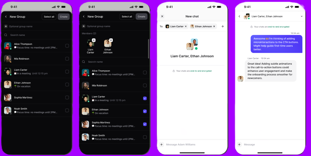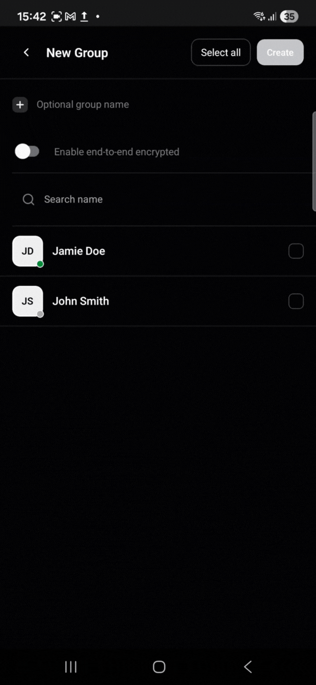 For the group chat, you can choose whether the chat will be end-to-end encrypted or not. Additionally, you can type the group name. You can also change the group name later, after clicking the ‘Info’ icon on the chat.