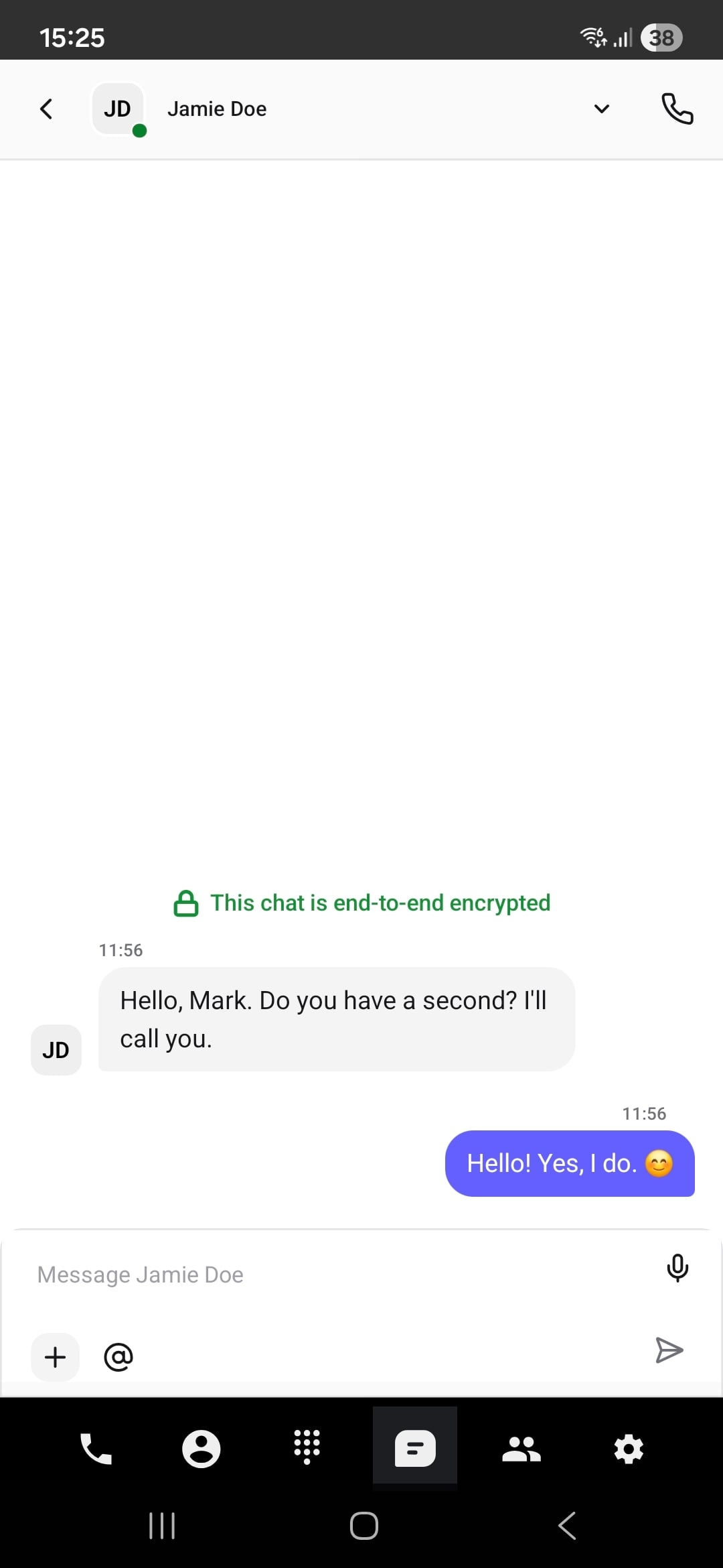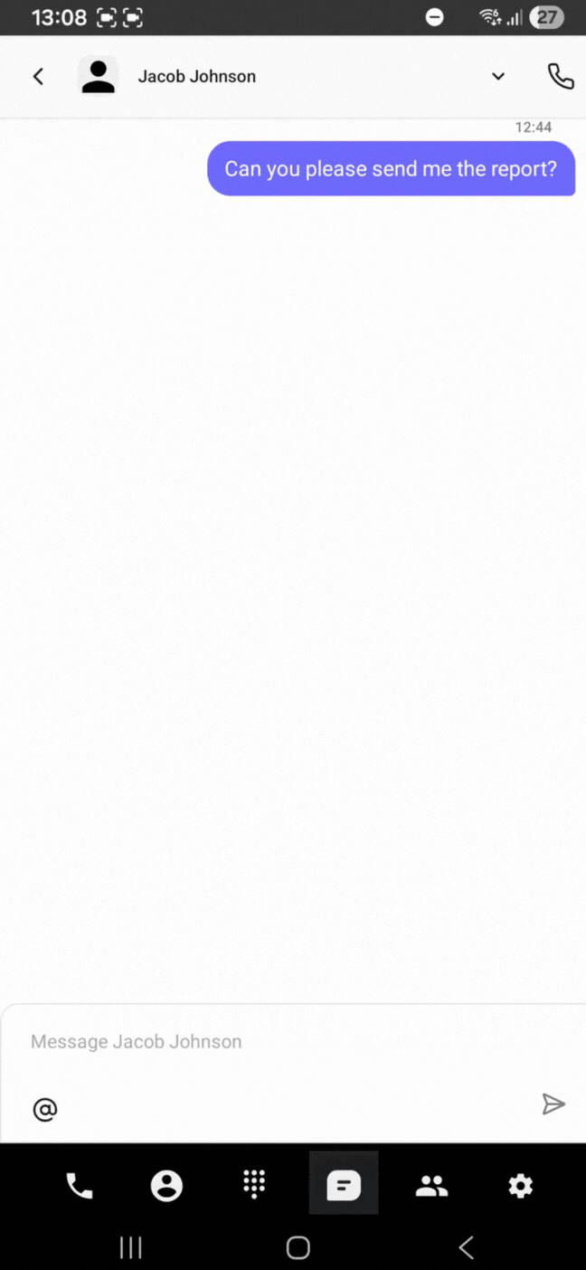 A: Tap the call button in the chat view to make an internal phone call with the contact.