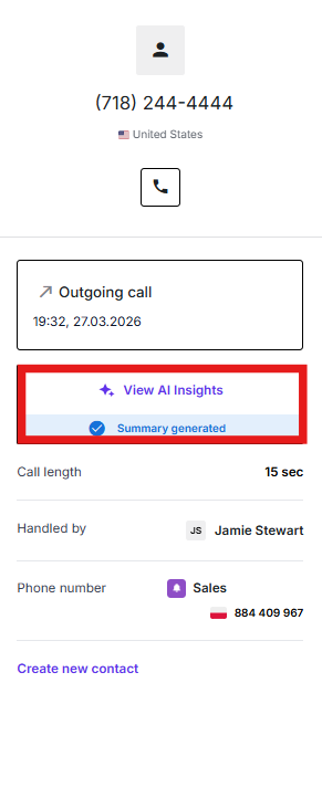 After activation, the feature becomes available for every conversation. Simply click on a specific conversation, and then select the “View AI insights” option to access its summary.
