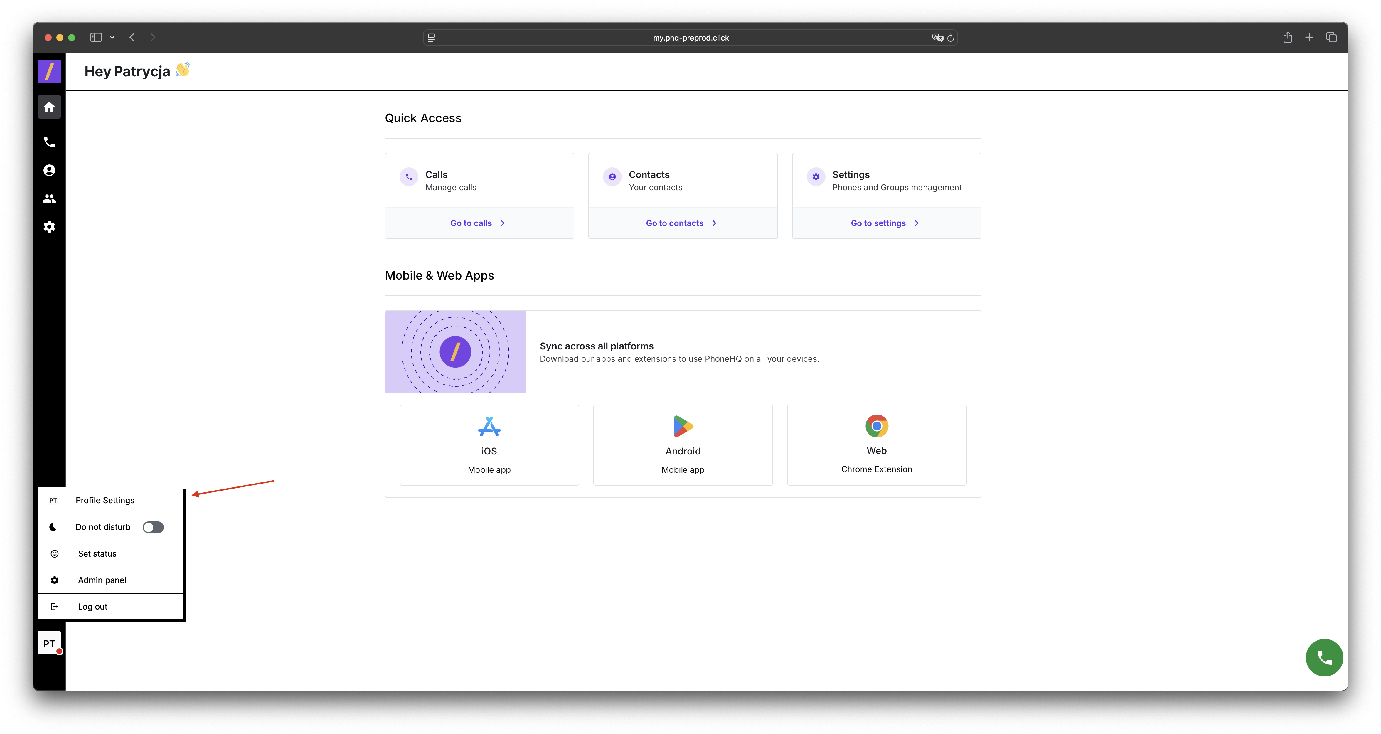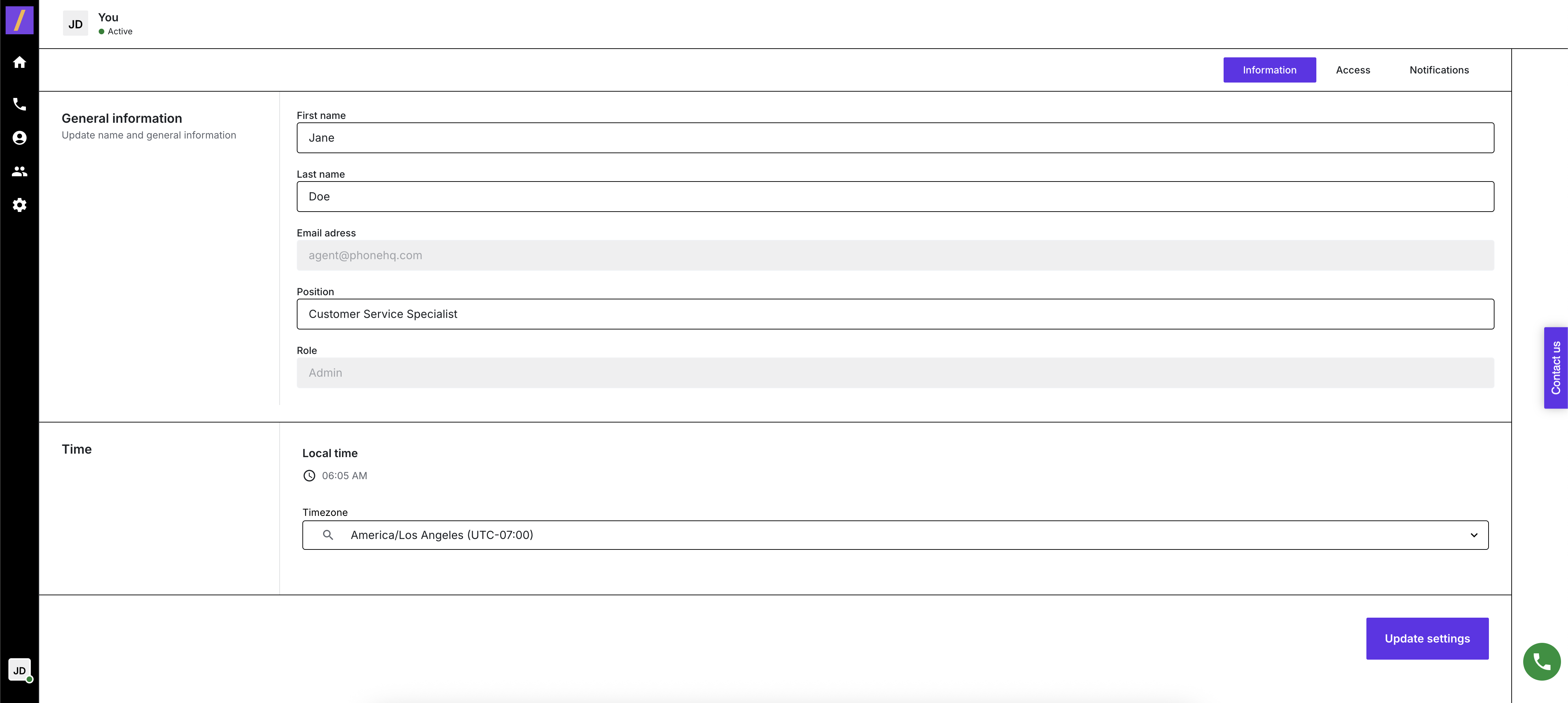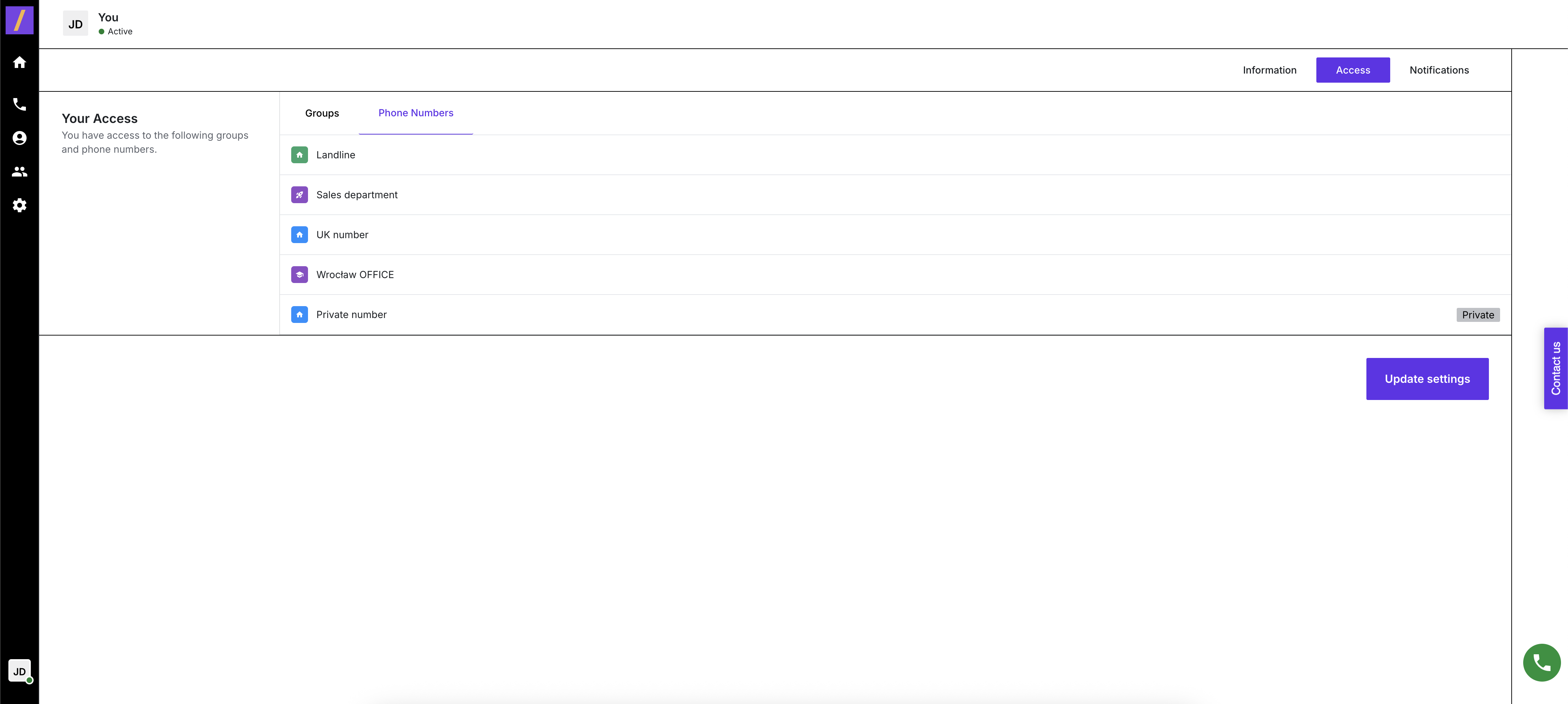 In the “Profile Settings” section of the Web Portal, you can update your general information, such as your first and last name and job position. This section also provides a view of the phone numbers assigned to your profile and the groups you belong to. Additionally, you can manage missed call notifications and switch the Web Portal's visual theme.
