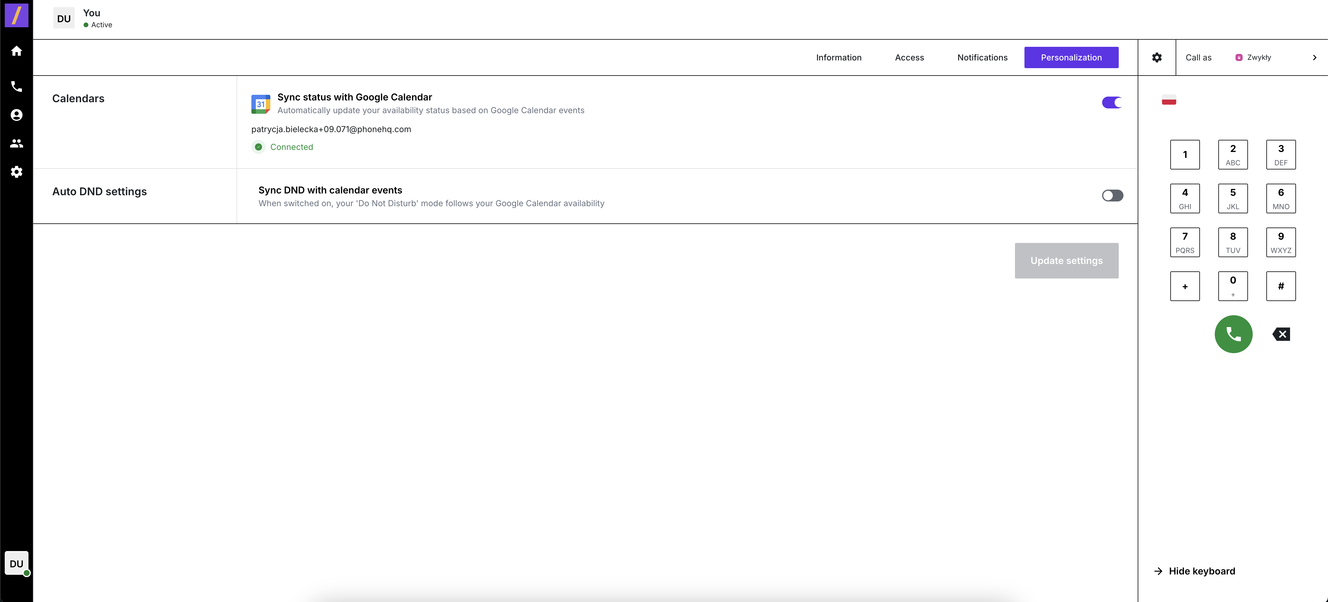 Your availability and DND status will now automatically adjust based on your Google Calendar events, so you won’t receive calls during scheduled meetings.