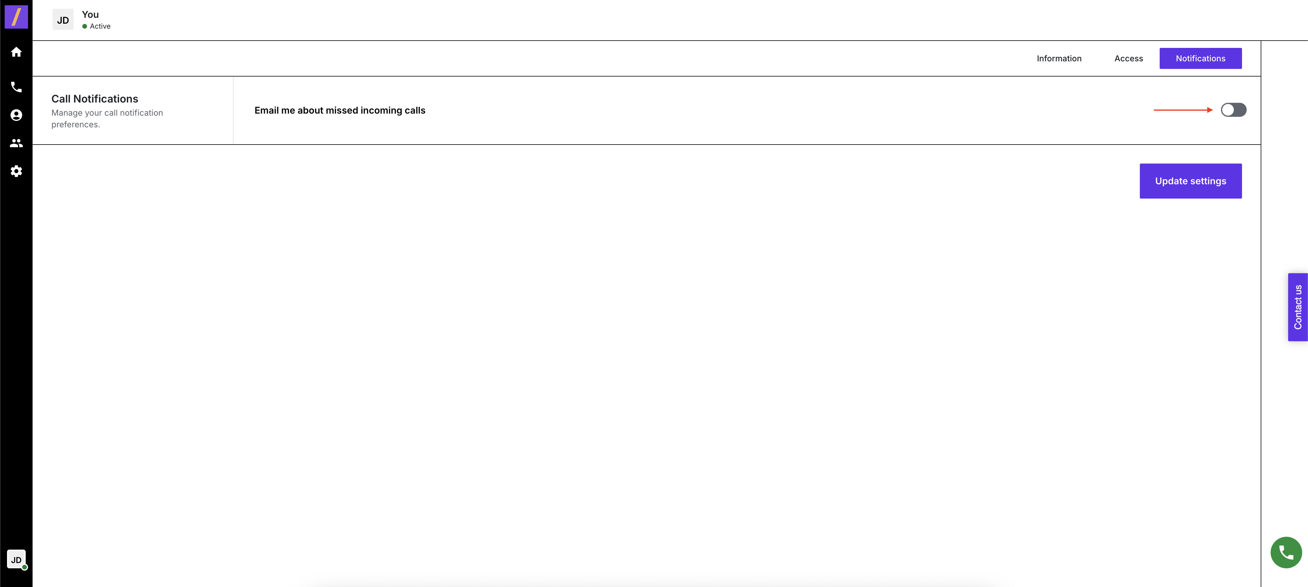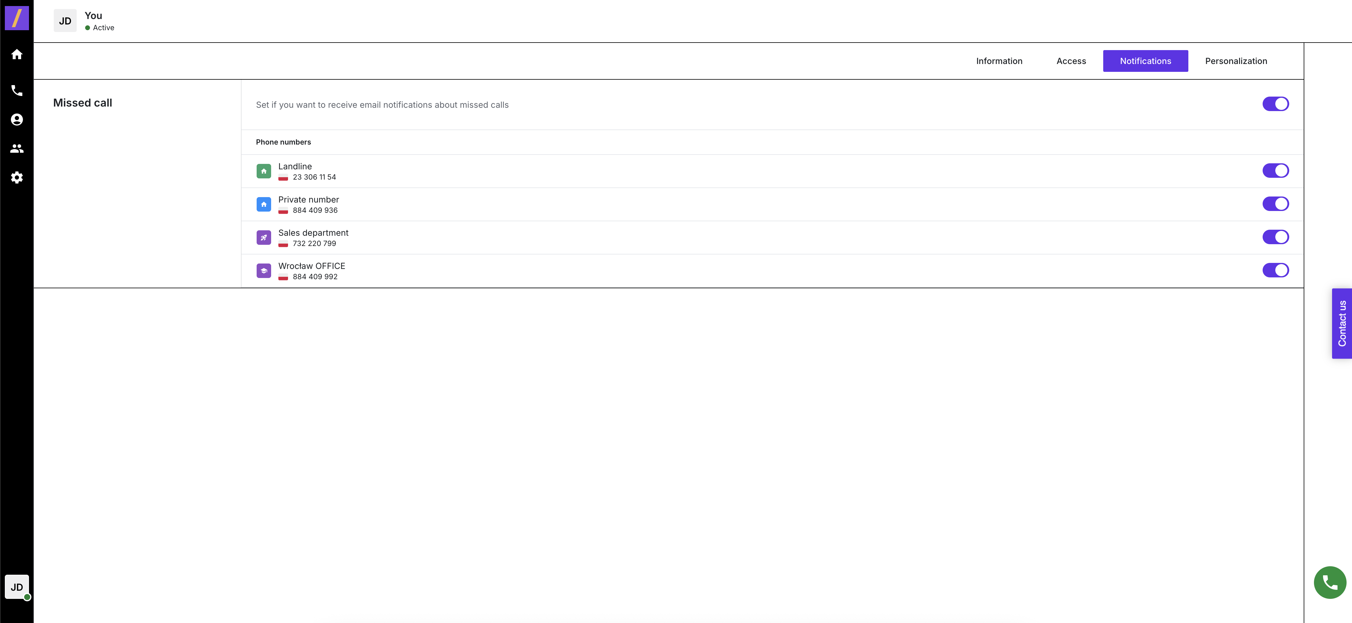 To enable or disable notifications, click the switch button in this section and choose which phone number assigned to you should be notified about missed calls