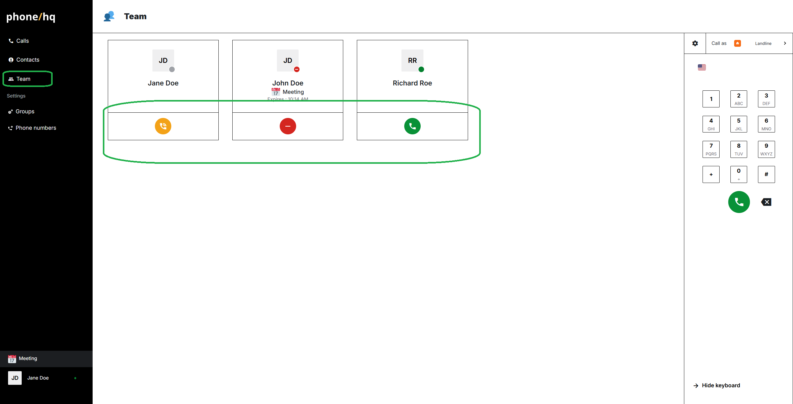 To initiate the call, click the phone icon below the name. The call will start and appear as ongoing on the dialer panel.