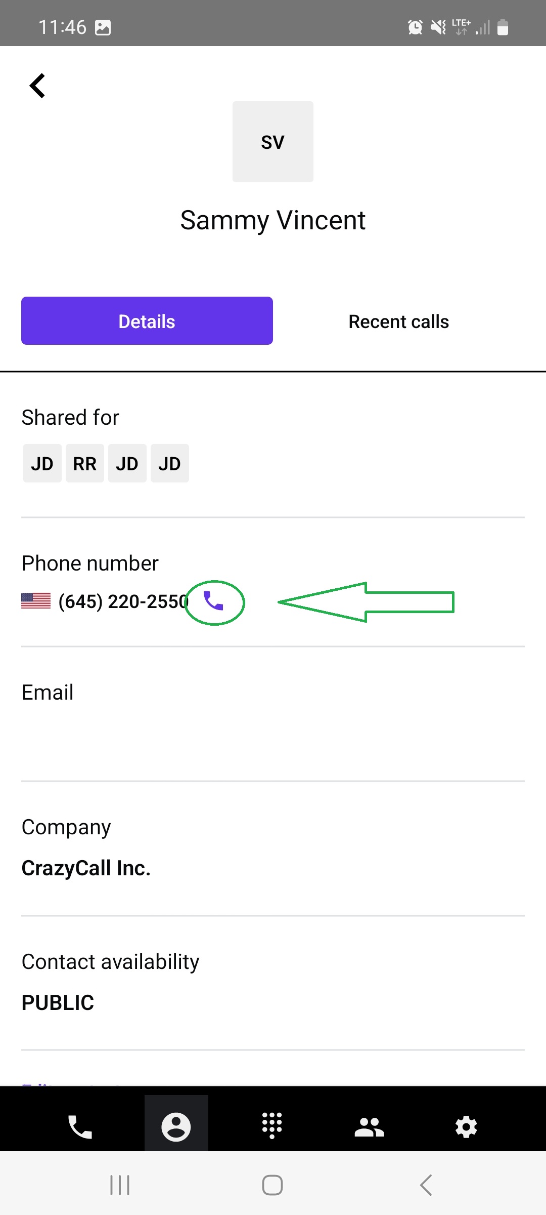 Once in the contact details, tap the phone icon next to the phone number to initiate the call.
