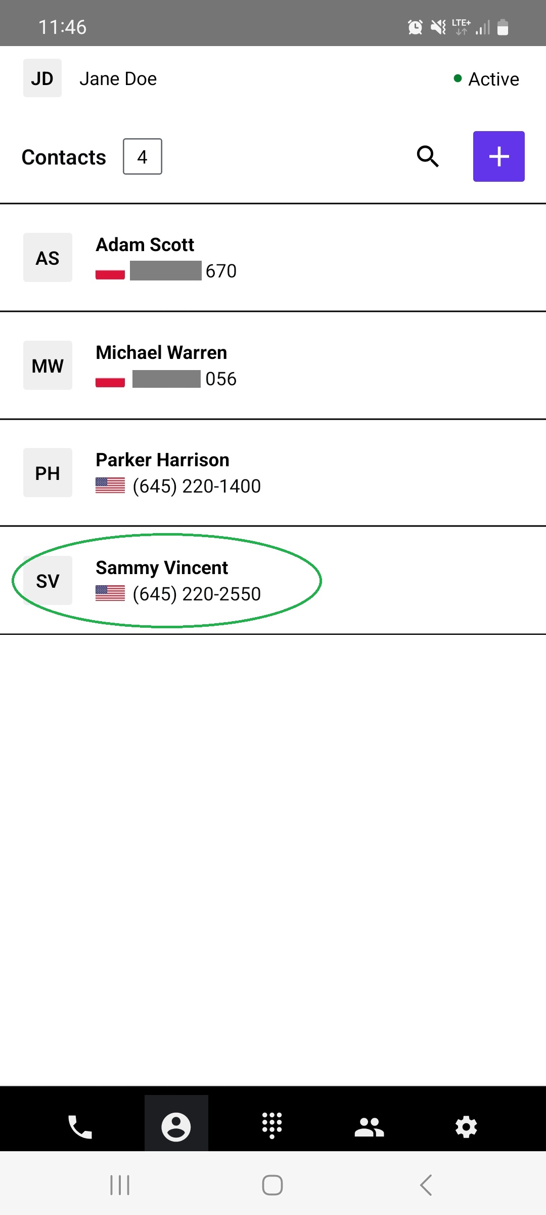 Open the contacts list by tapping the second icon from the left on the bottom menu bar.