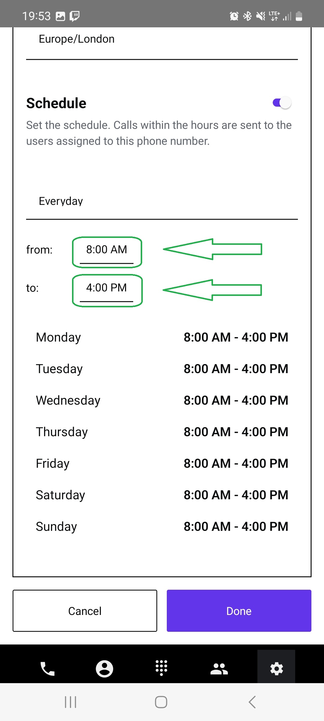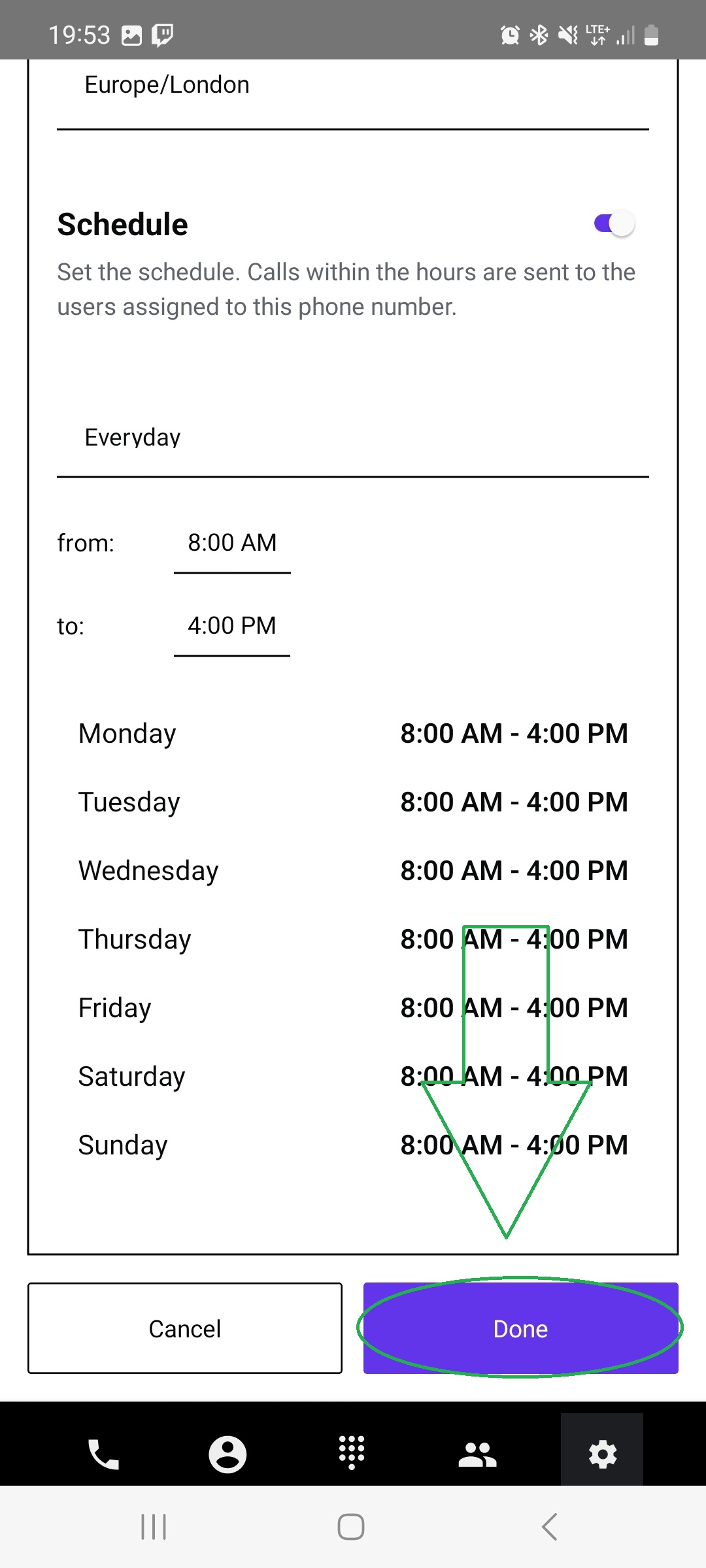 Once the hours are set, tap the “Done” button below the working hours panel.