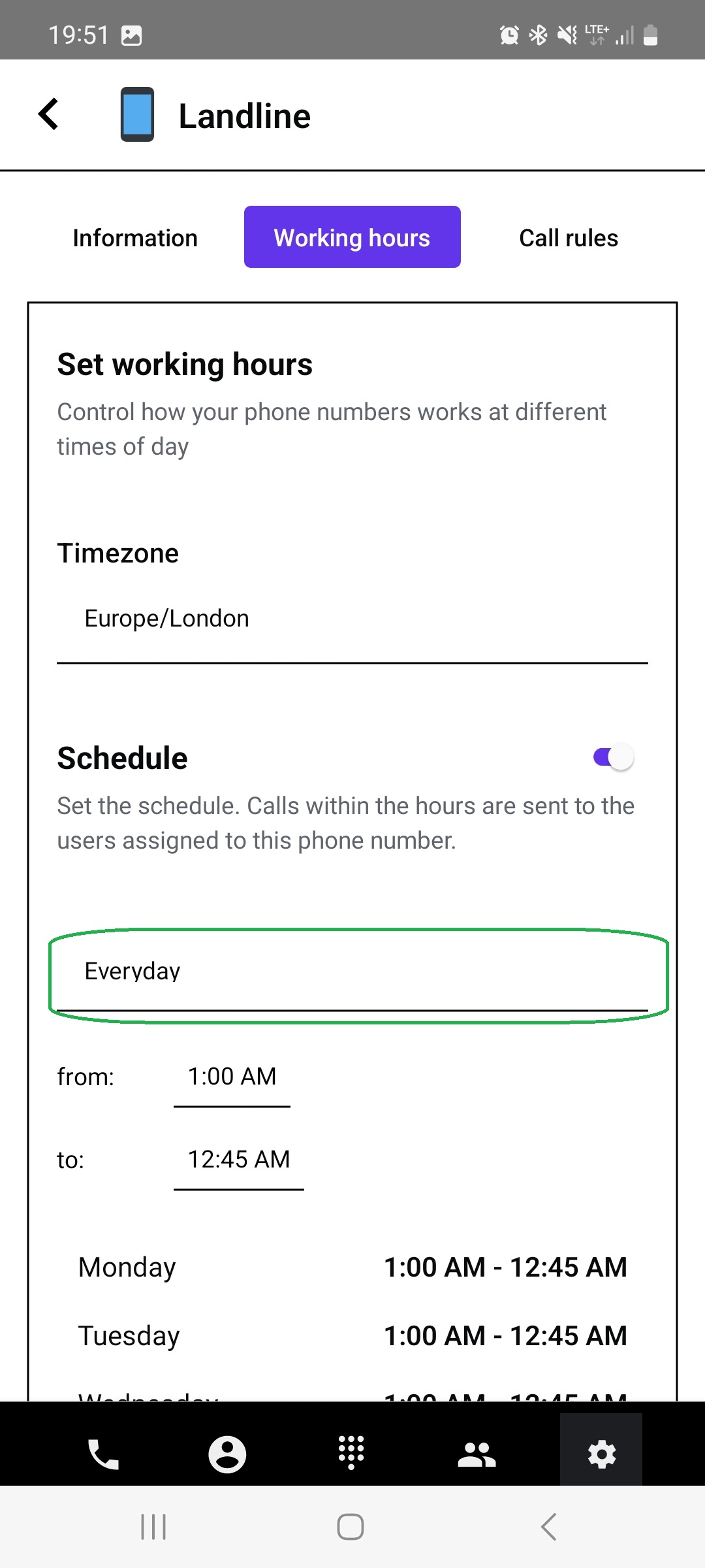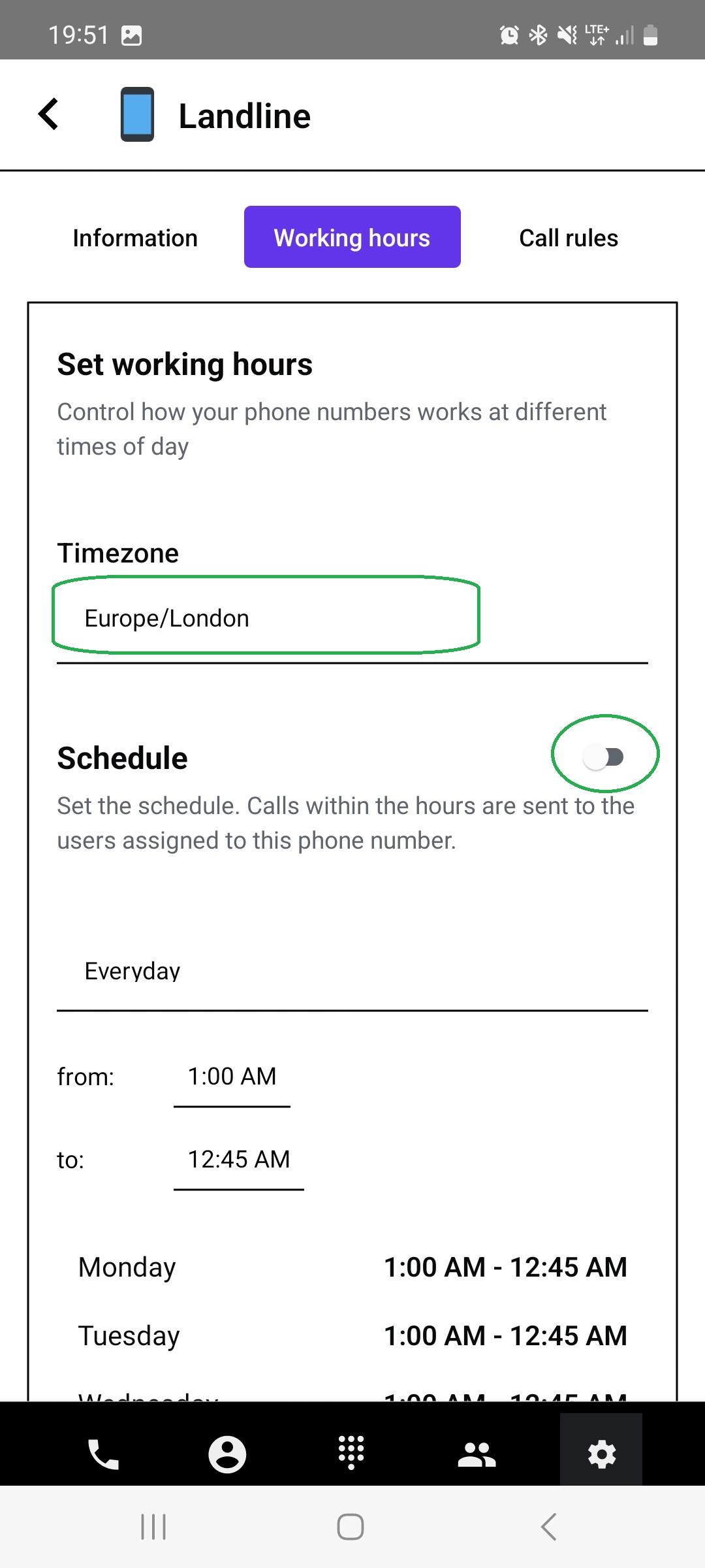 Working hours settings are part of the phone number management section, accessible in the number details tab.