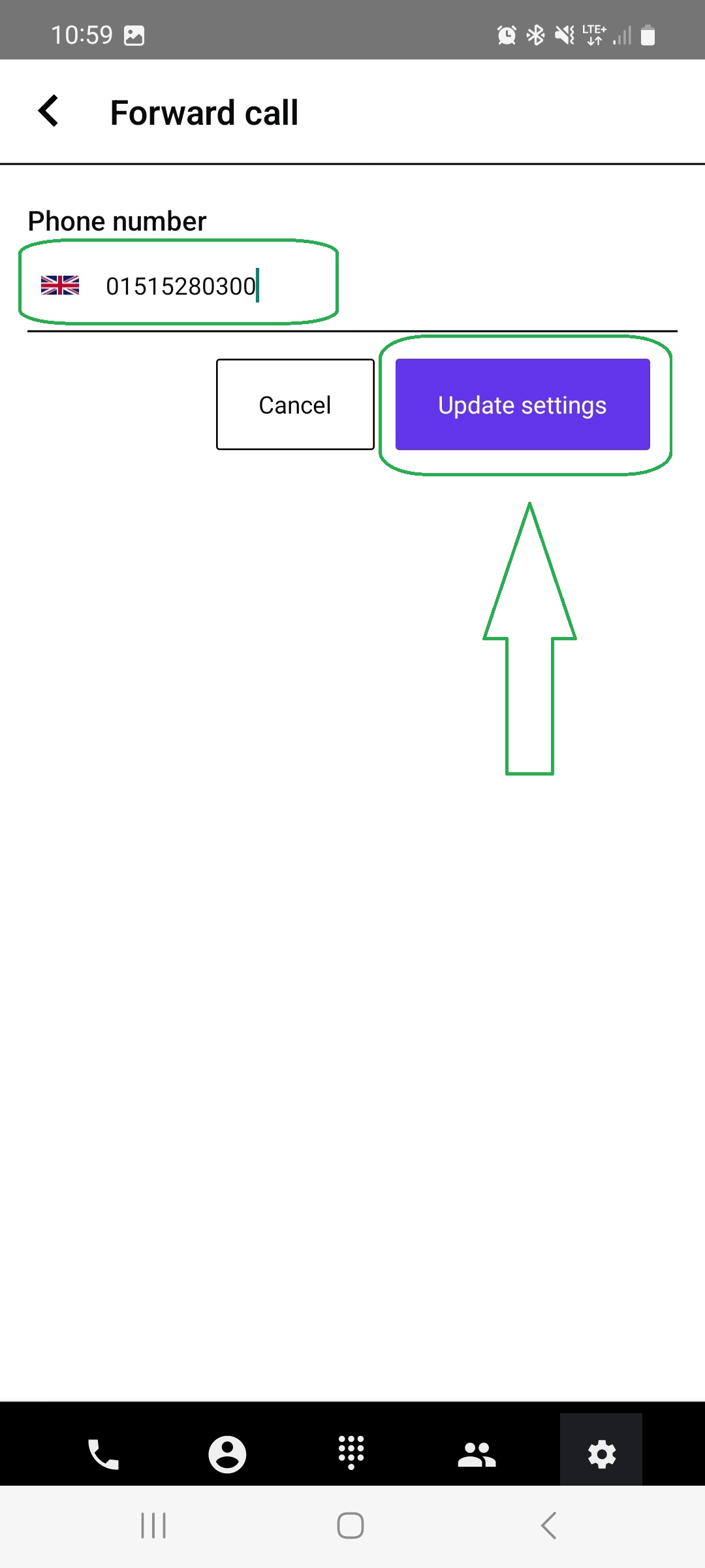 Enter the phone number you want incoming calls to be forwarded to. Ensure you select the correct country flag or type the number with the country prefix (e.g., +1 for the US, +44 for the UK).