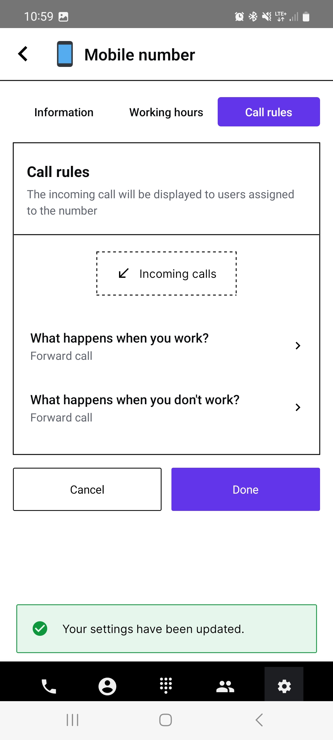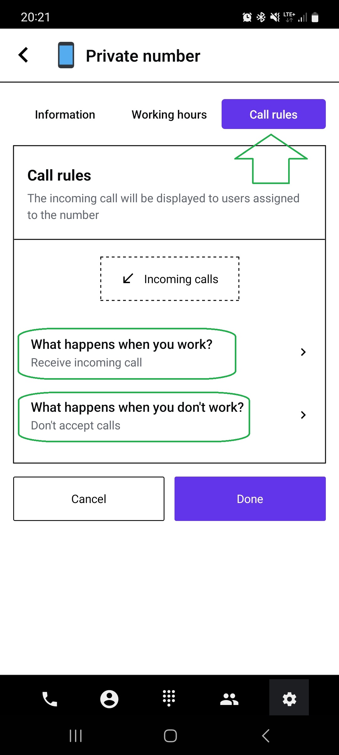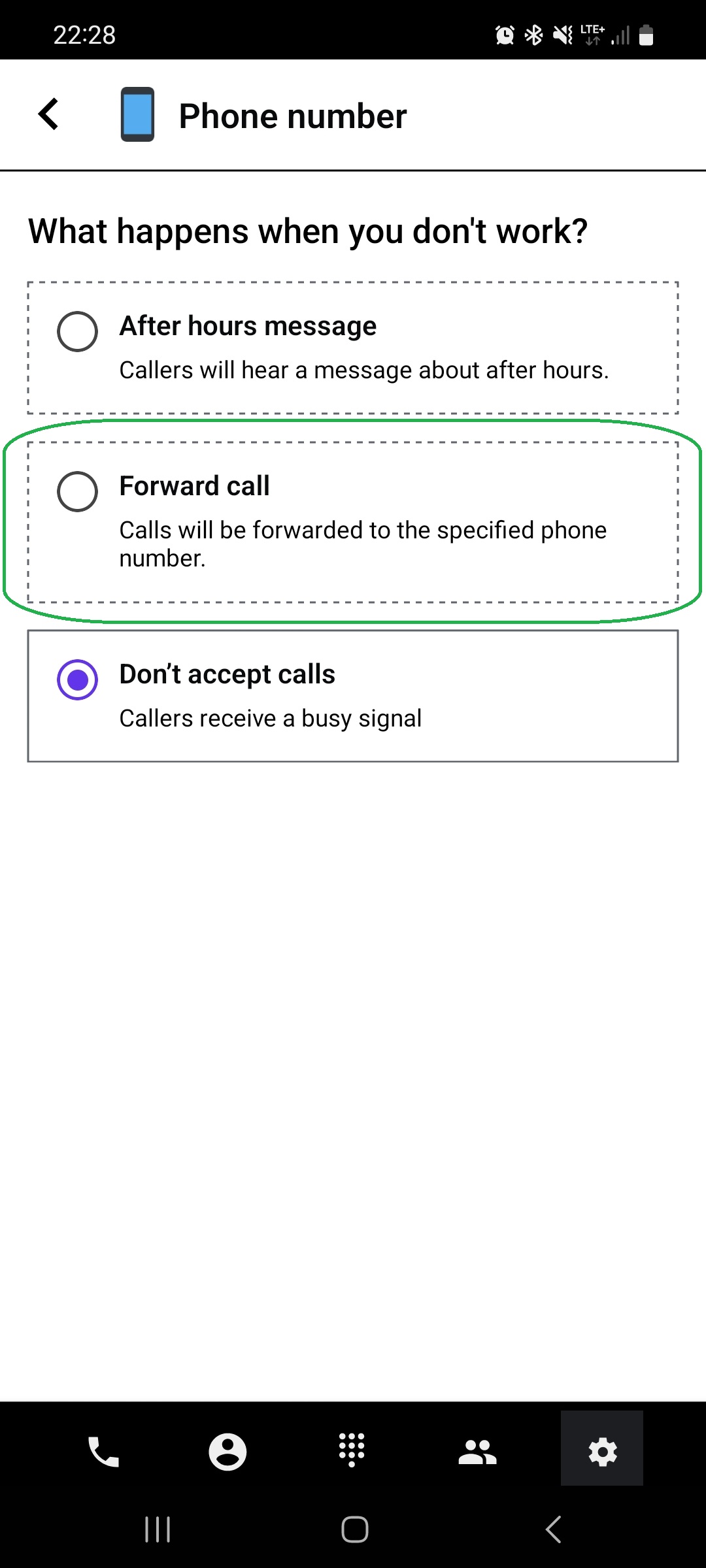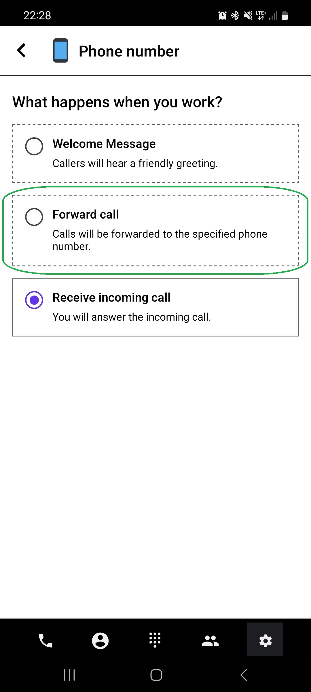 Forwarding is possible for both, PhoneHQ and external numbers. This feature is a part of the phone number management section, accessible in the number details tab, under the “Call rules” section. You can set up a call forwarding. This feature can be set up for calls within your working hours, as well as for those incoming when you don't work.