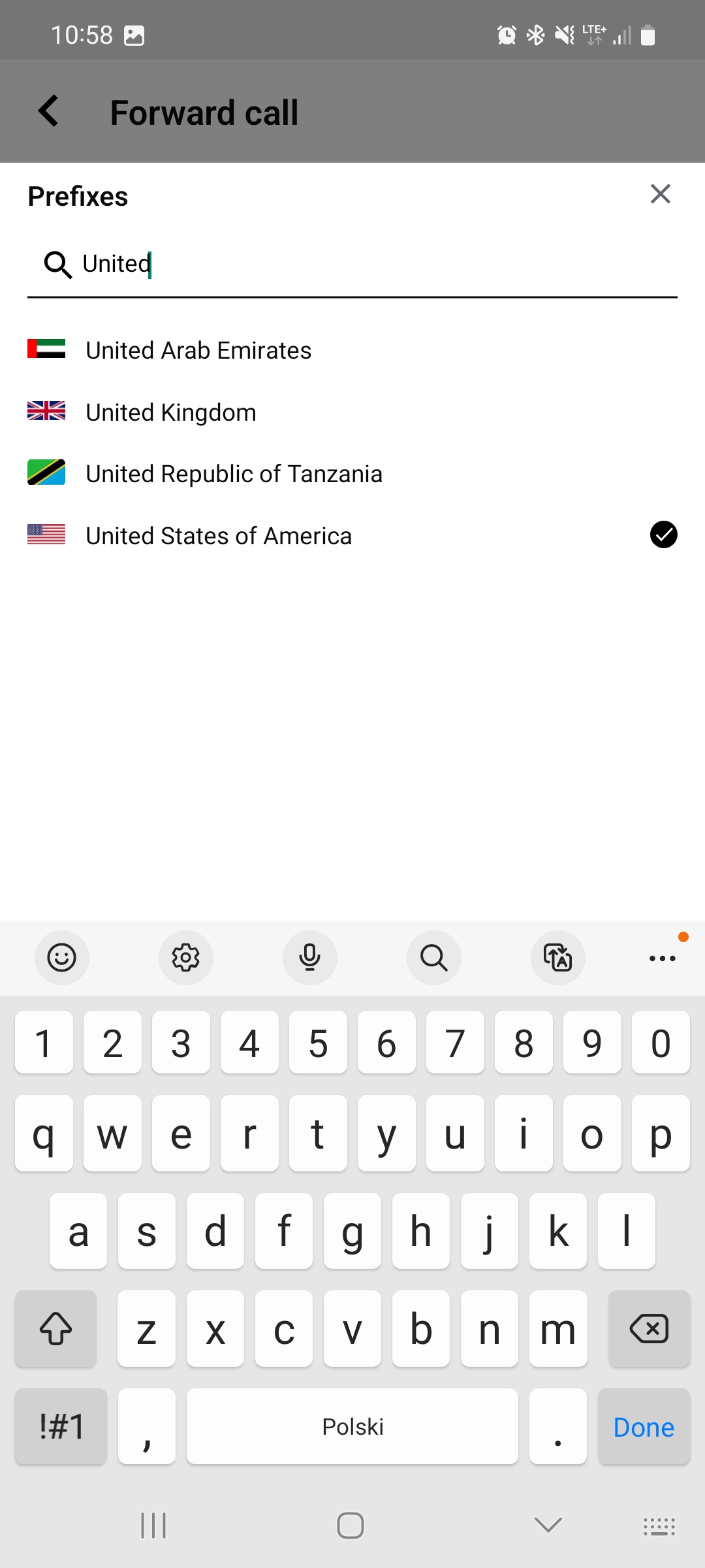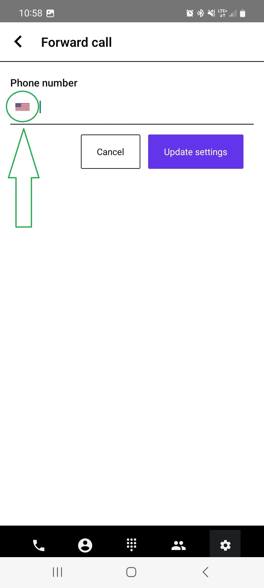 Choose prefix/country of the number you want to forward calls to by tapping the flag and selecting from the list.