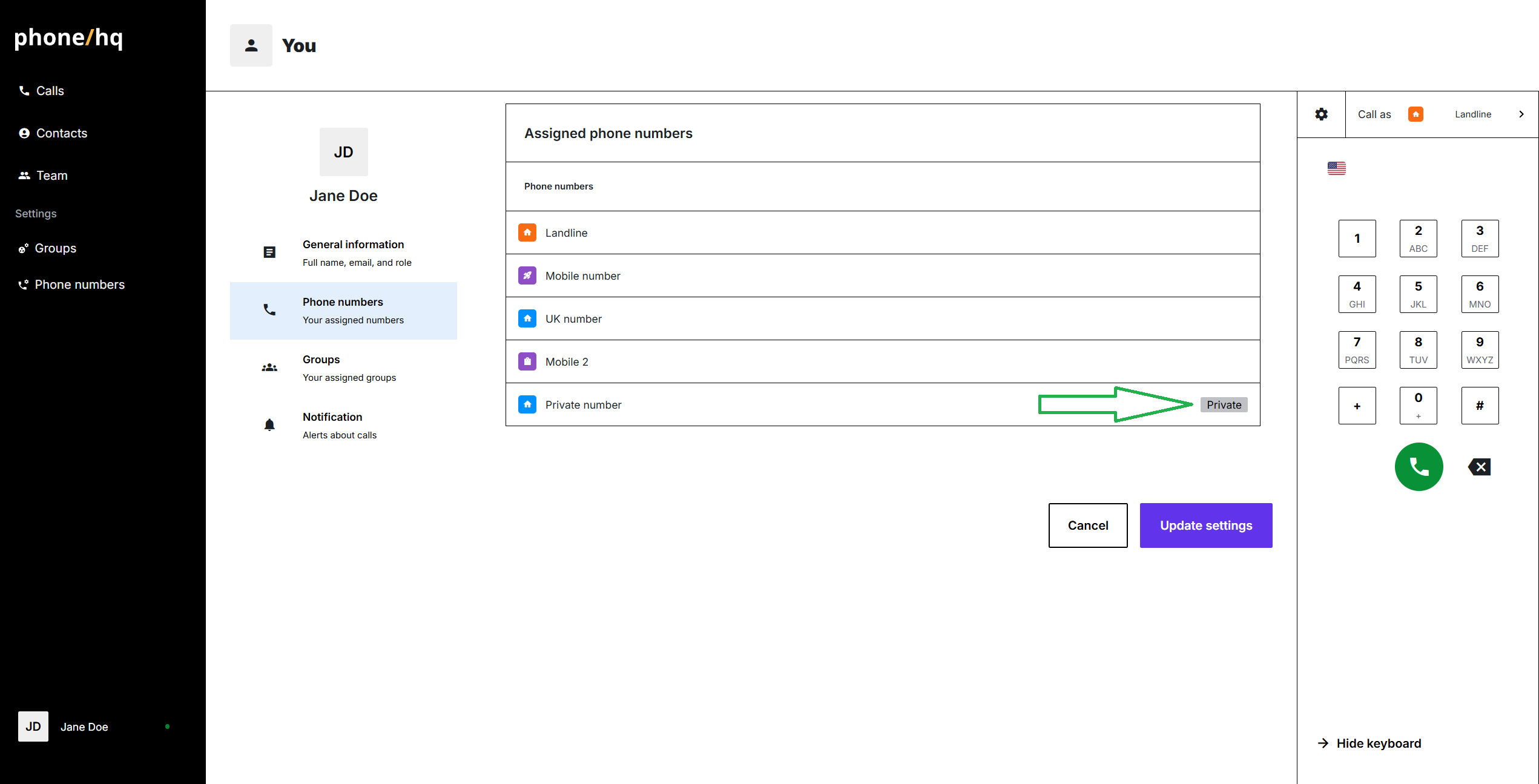 A private phone number can be assigned to only one user at a time. Once assigned to an account, only the assigned user and Admins can see it, but only the assigned user can make calls using it.