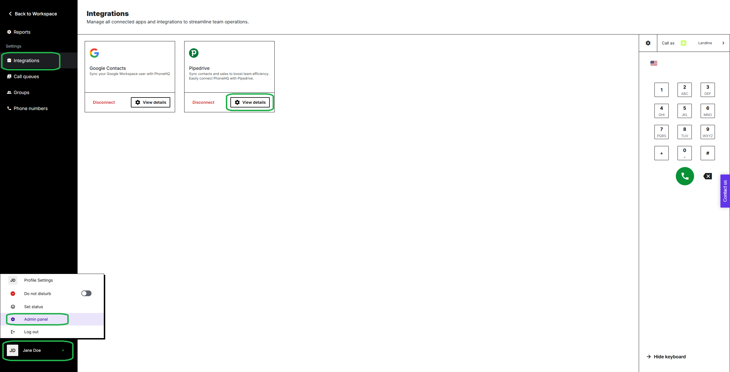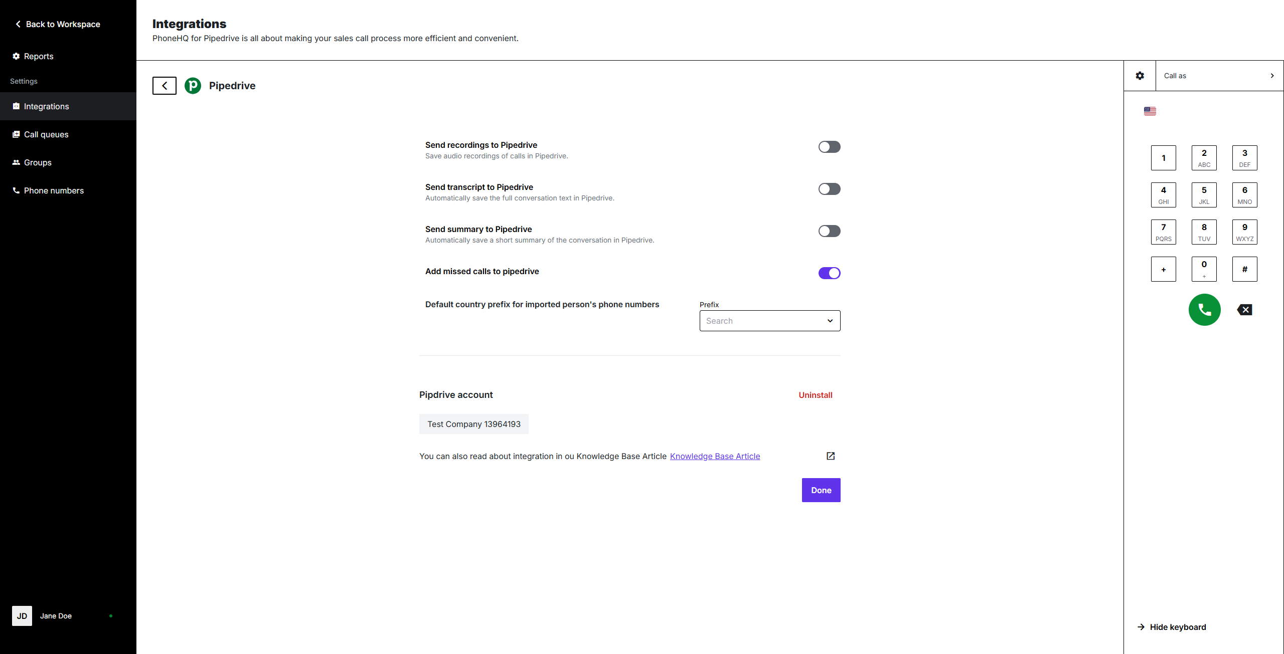 Admins can disconnect PhoneHQ from Pipedrive using the “Uninstall” button in the integration settings. This action will stop automatic call logging, contact syncing, and data exchange between the two platforms.