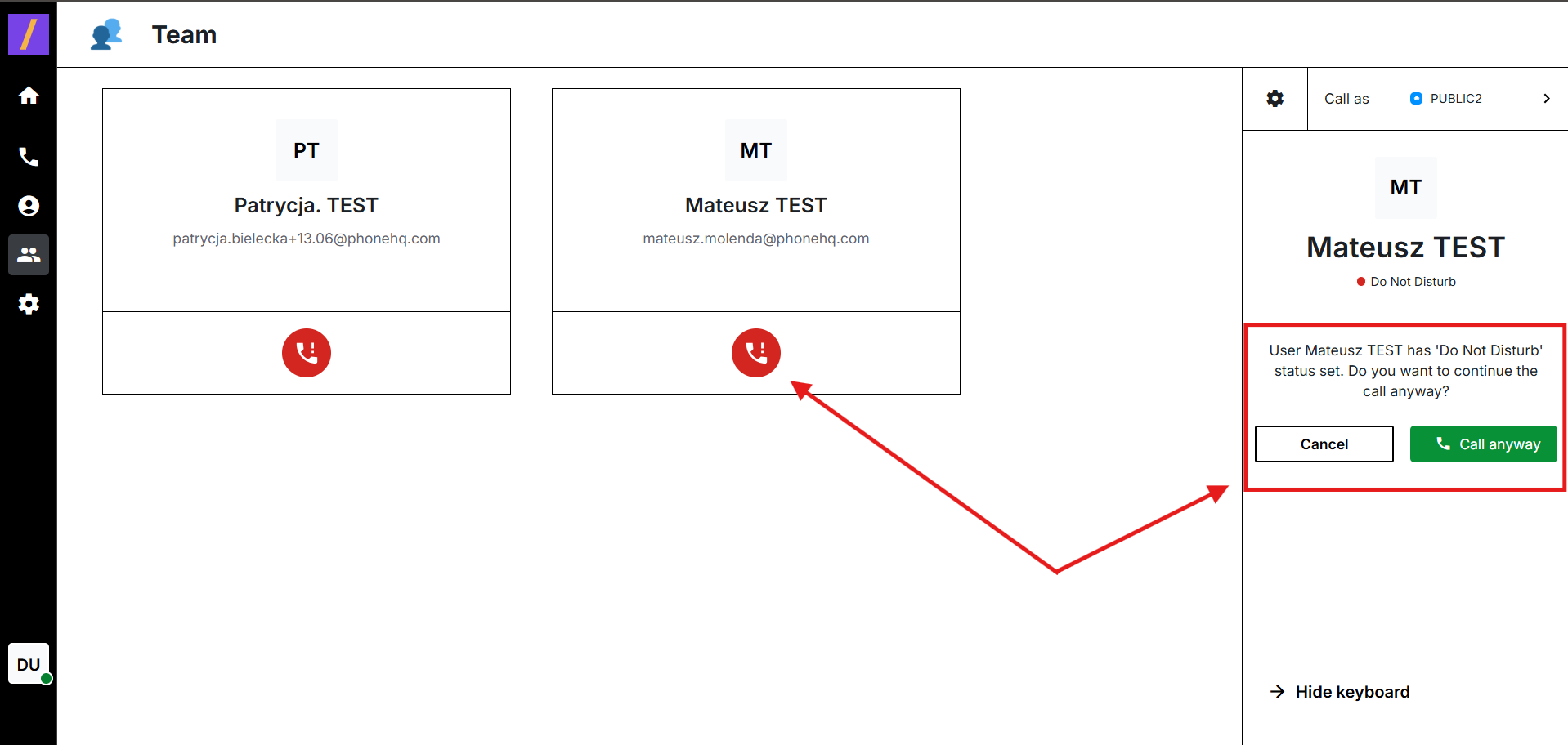Before placing a call to a user with Do Not Disturb turned on, you will be notified of their status. If you still wish to proceed, simply click the Call anyway button.