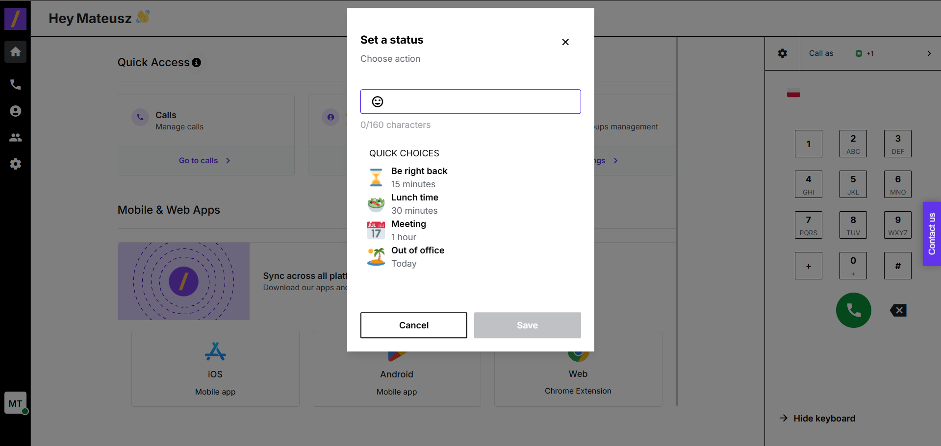 Status Window | The pop-up modal titled “Set a status” that appears when setting a new status in PhoneHQ. |