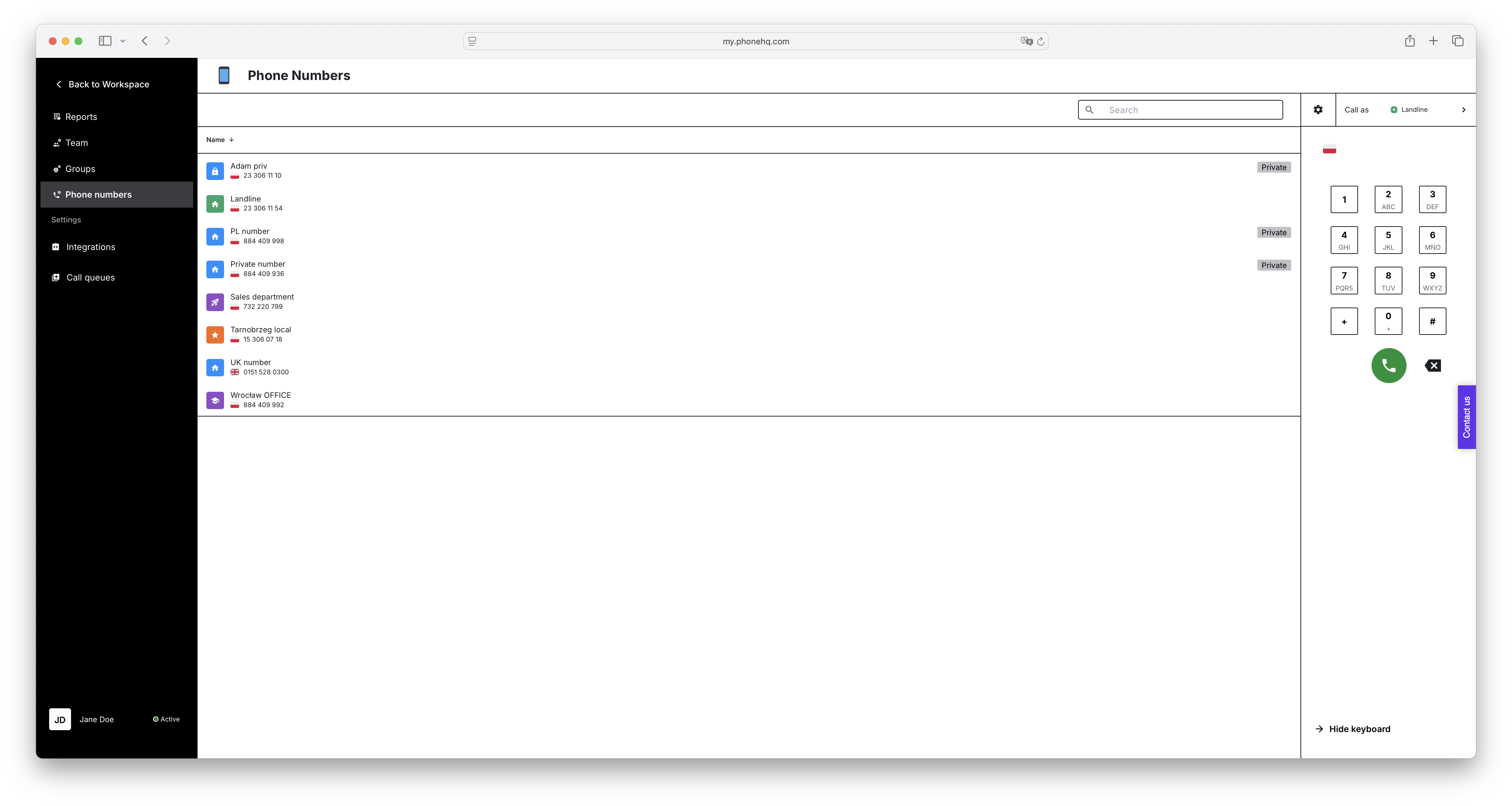 Browse the list of numbers: On the screen, you'll see a list of all phone numbers configured in the application, along with their names, country flags, and categories.