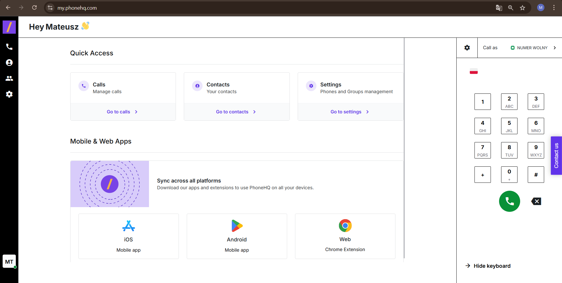 The Welcome Page serves as the initial screen you see upon logging into our browser application. Designed to provide a personalized greeting, it addresses you directly with "Hey, [User's Name]" and offers easy navigation to various sections of the application, along with quick links to our mobile apps.
