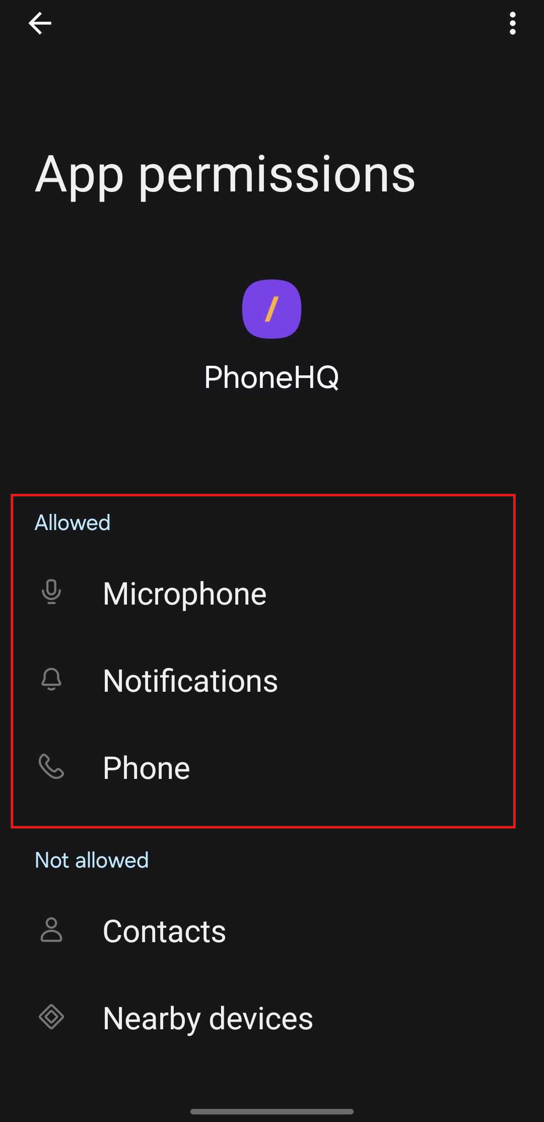 Go to: Settings > Apps > PhoneHQ > Permissions & Phone Accounts