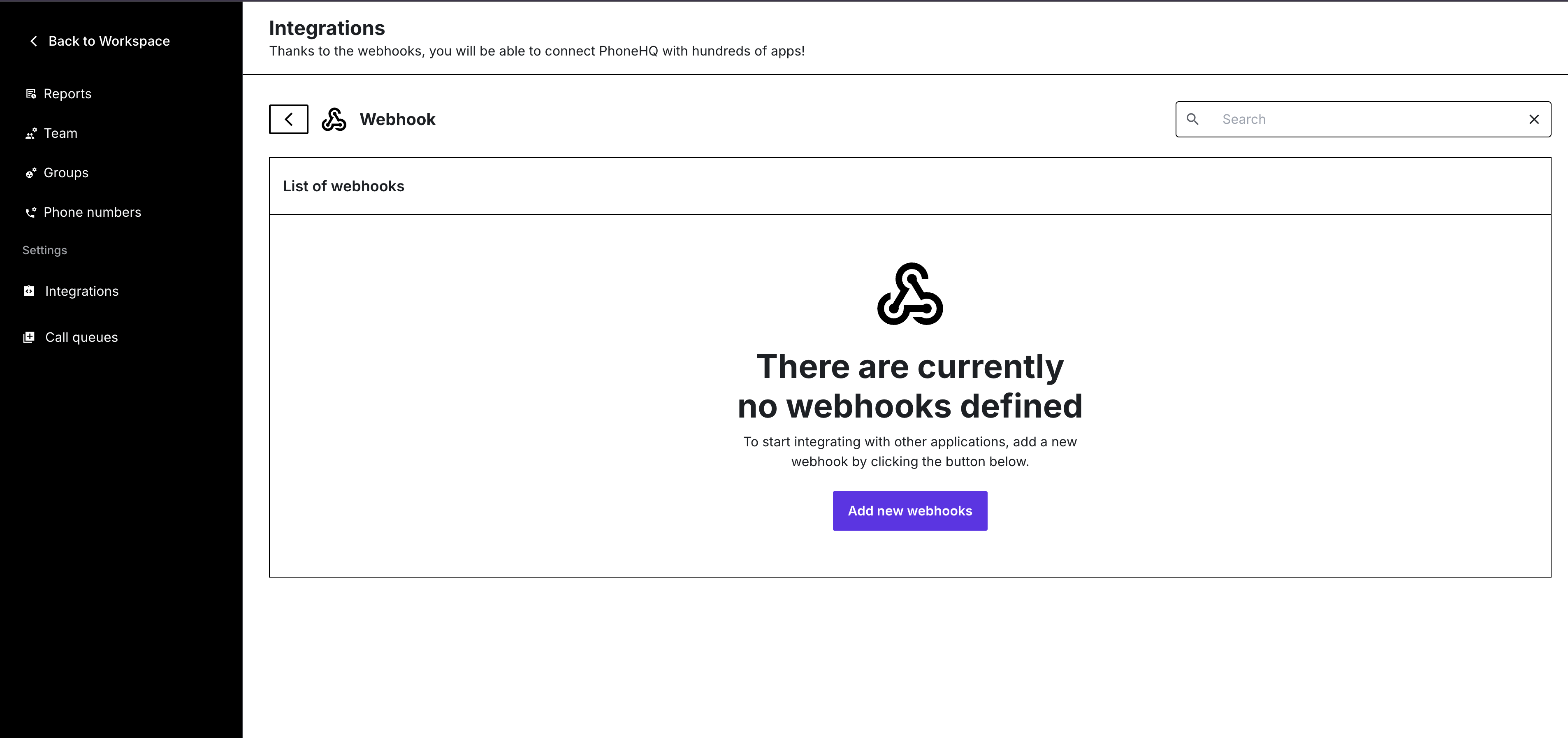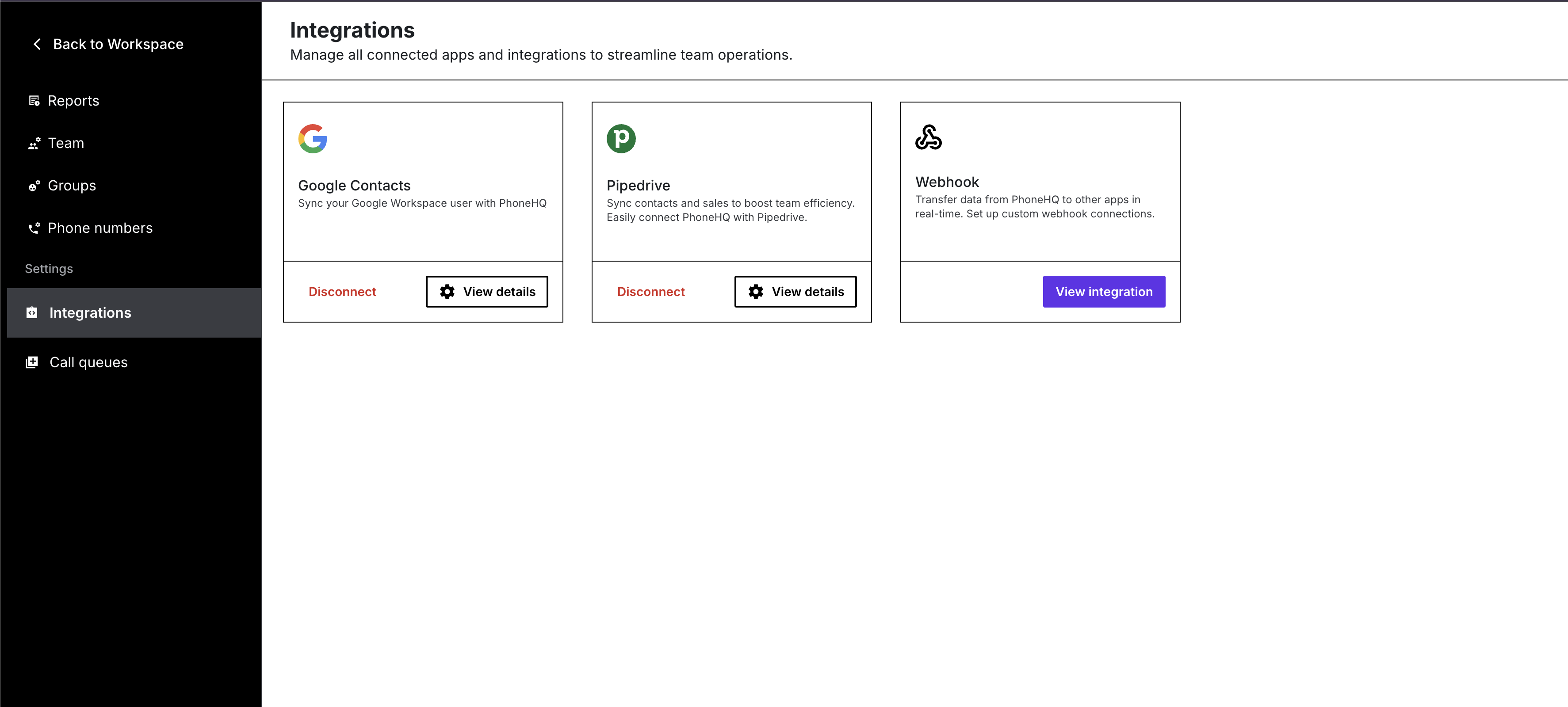 Integrations | The section in PhoneHQ where integrations (like webhooks) are managed. |
