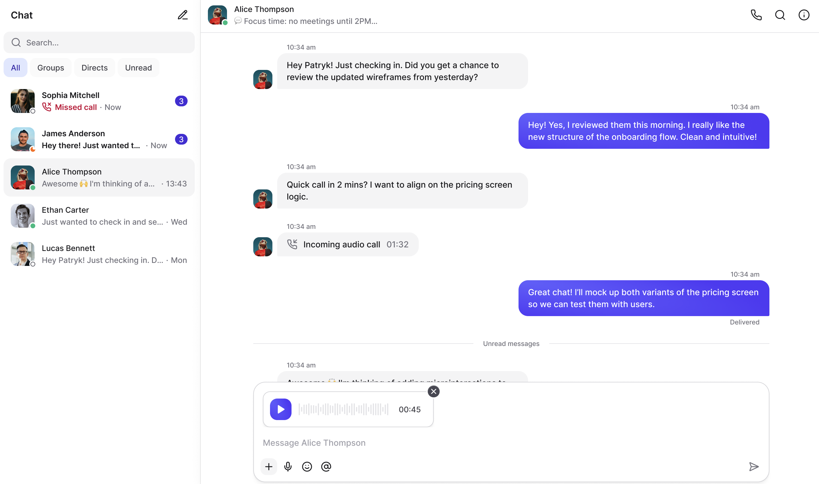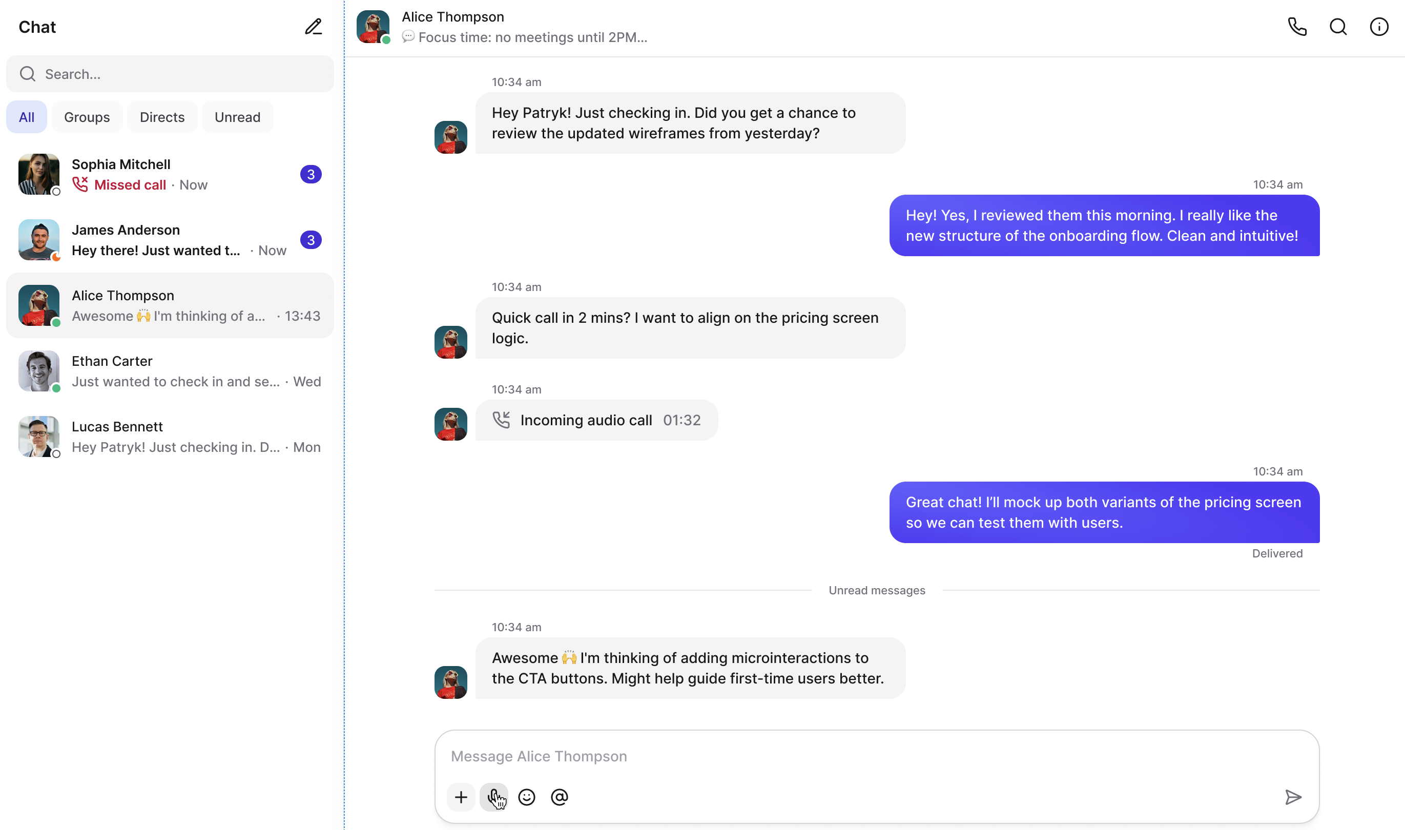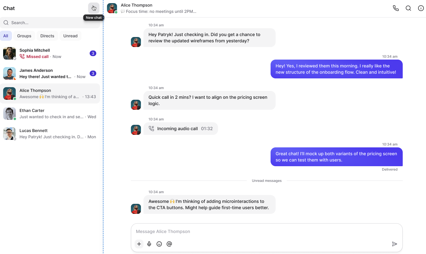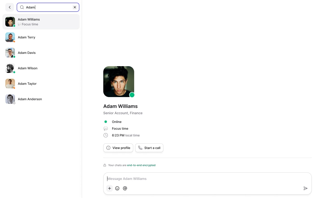 Statuses — next to names/avatars, you can often see availability (online, offline, busy, etc.).