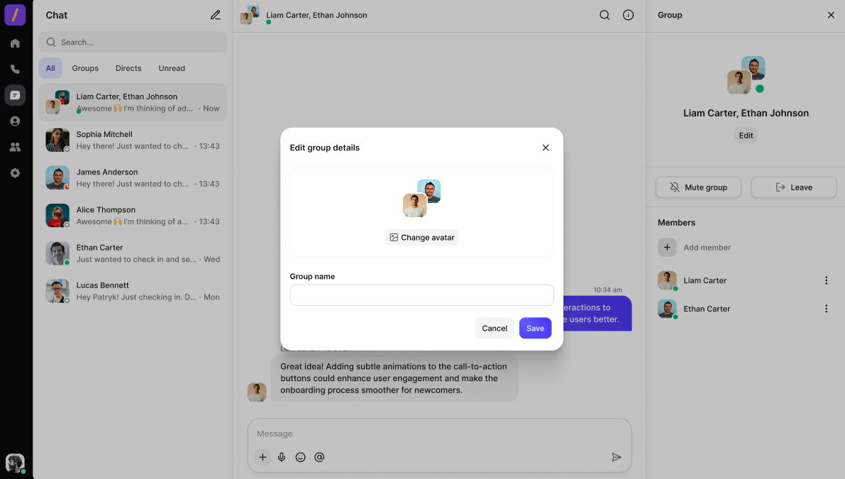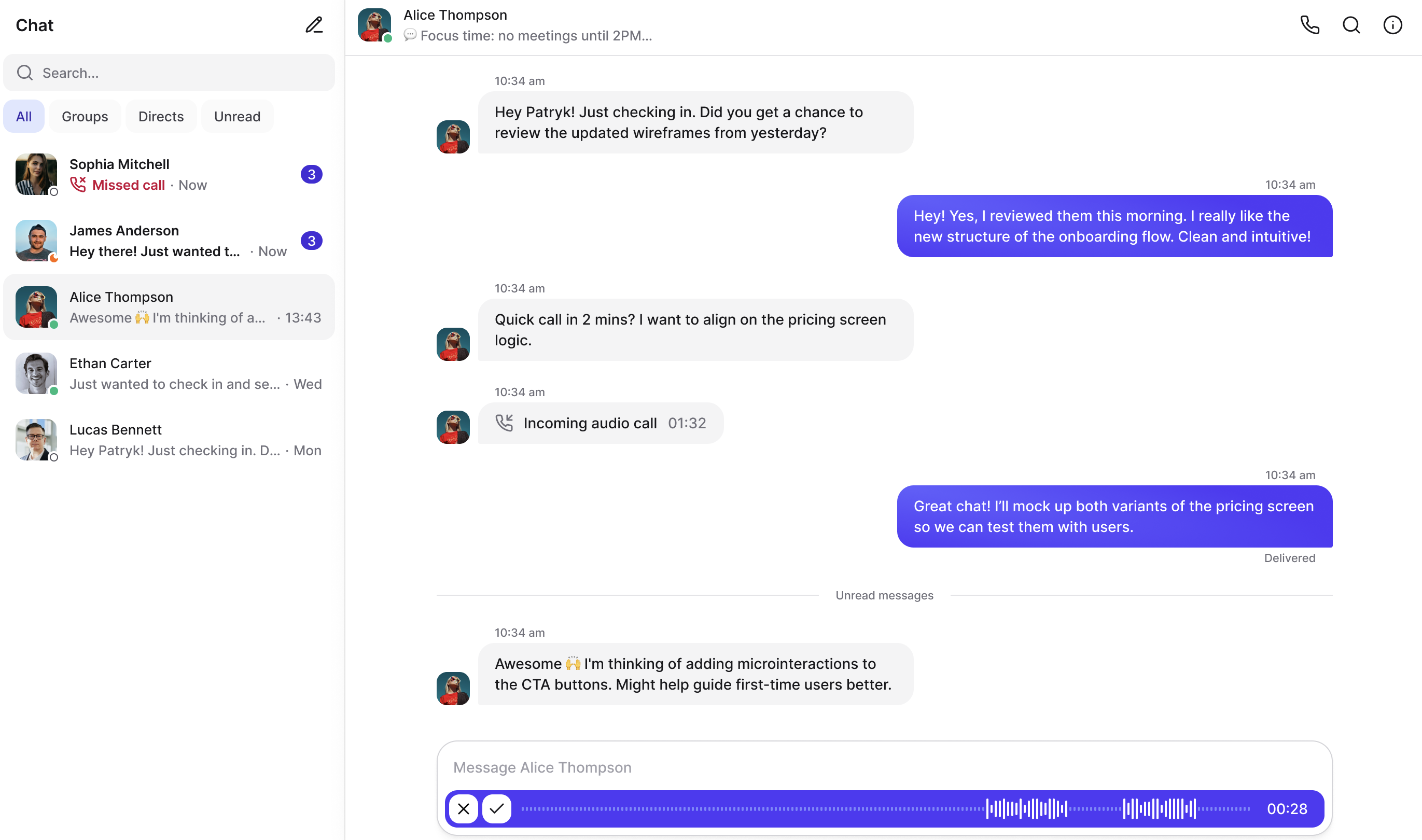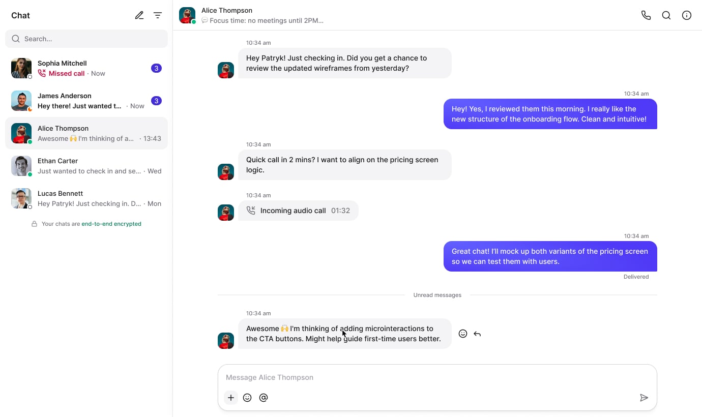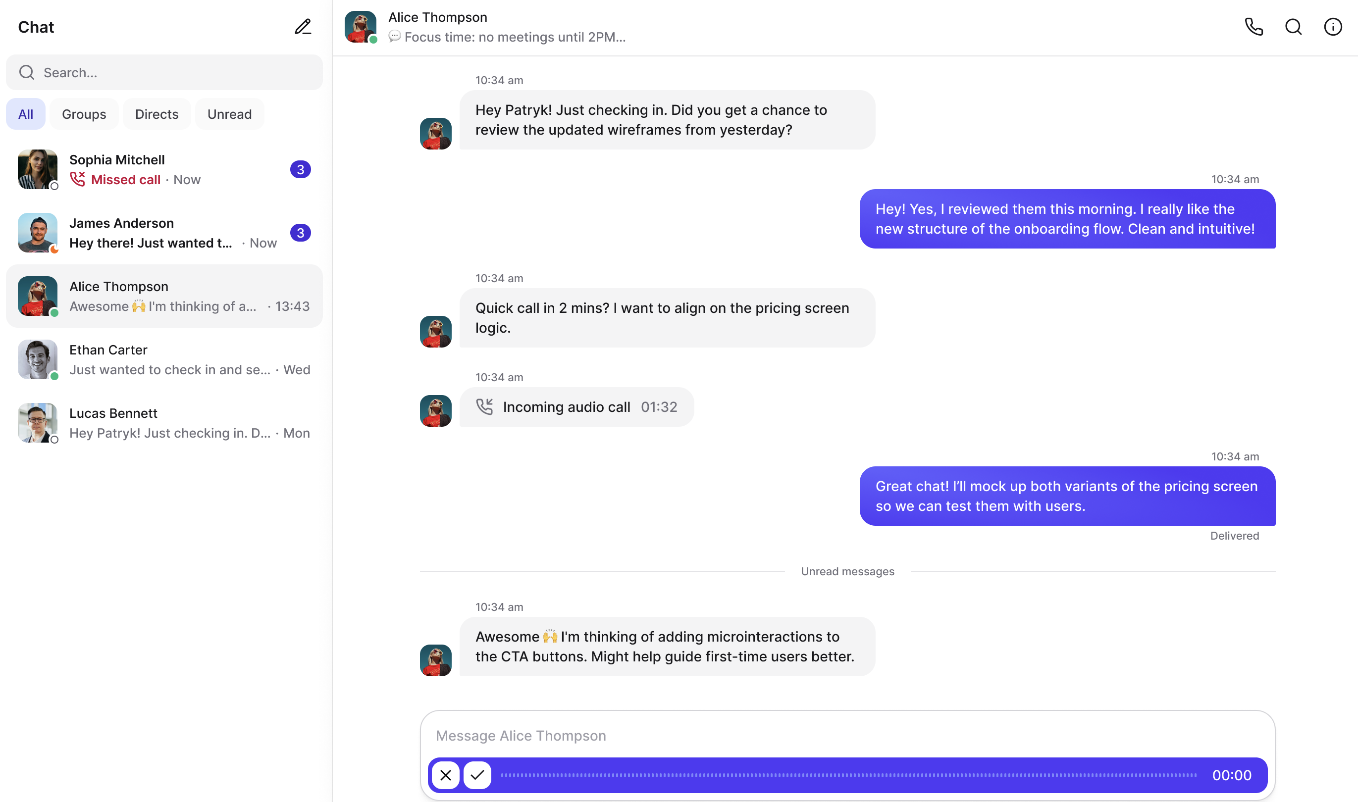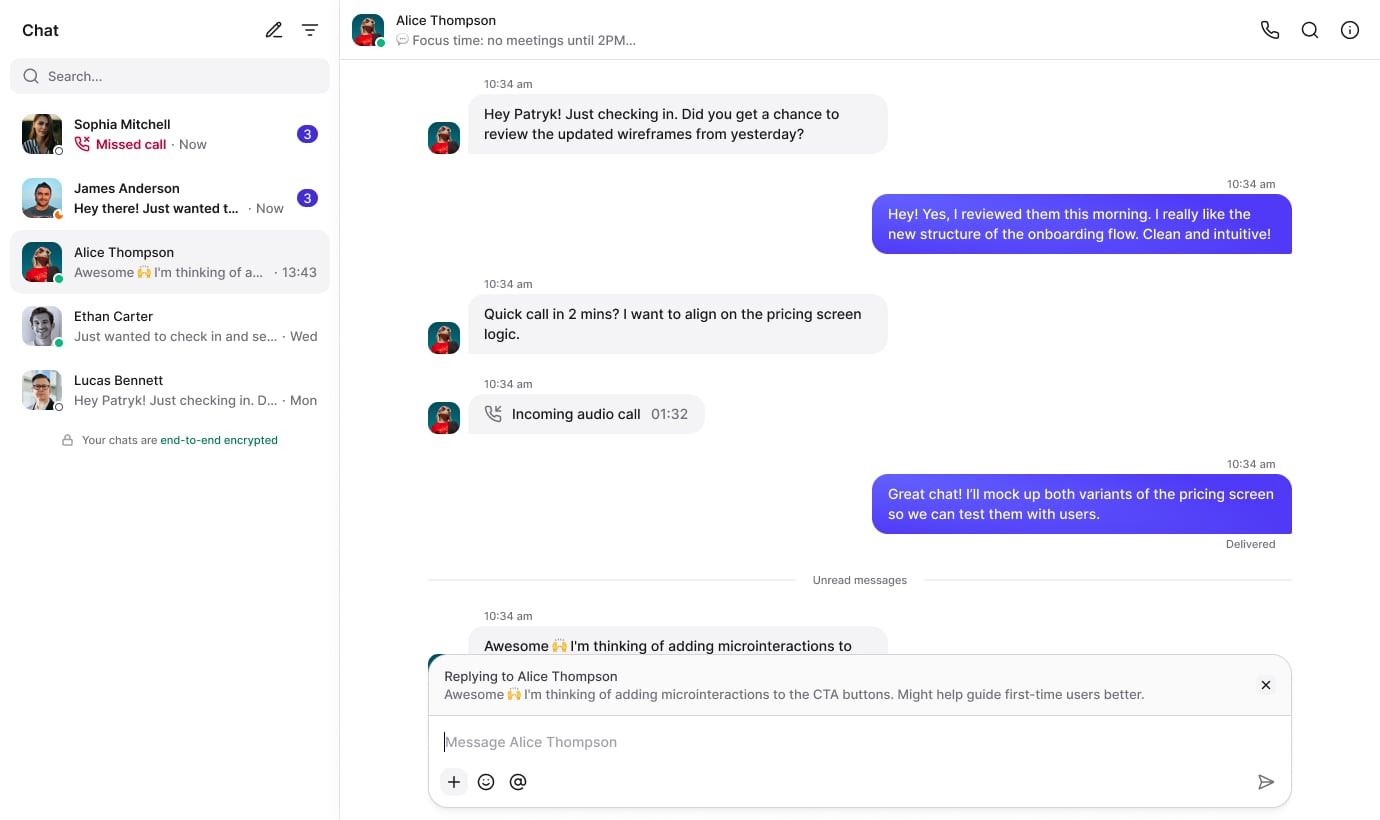 Statuses — next to names/avatars, you can often see availability (online, offline, busy, etc.).